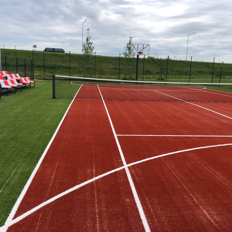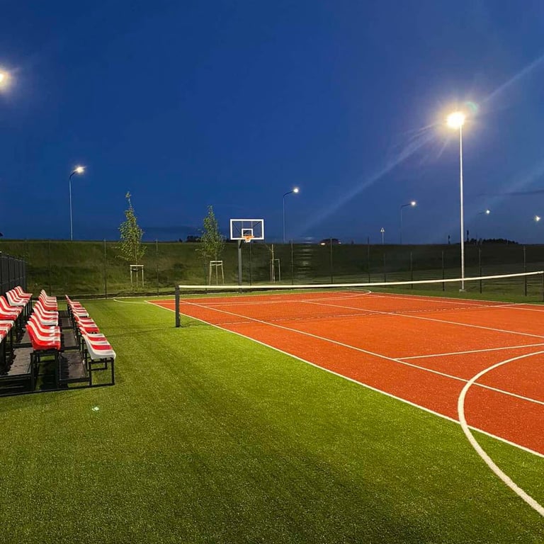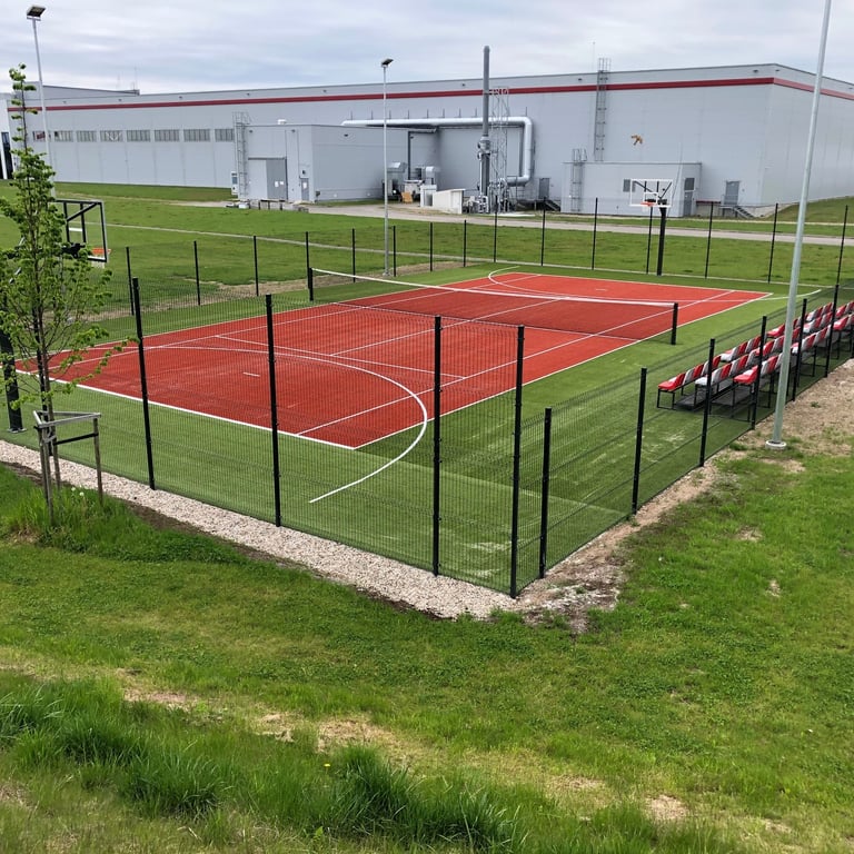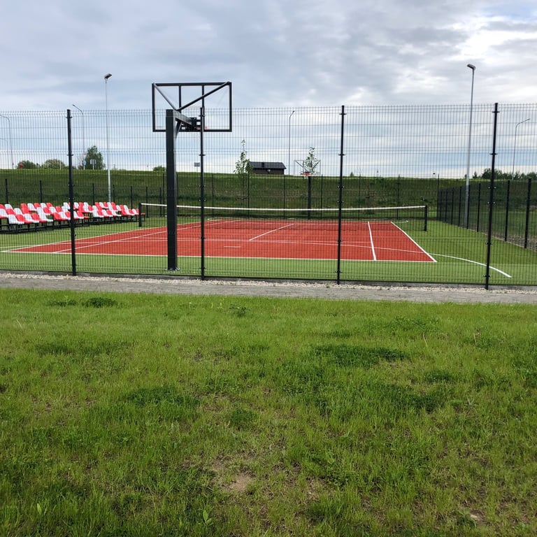 Atsakingas verslas rūpinasi savo darbuotojų gerove, todėl mums buvo patikėta įrengti krepšinio ir teniso aikštelę gamyklos darbuotojams. Darbai atlikti laikantis visų sporto aikštėms keliamų standartų: atlikti žemės darbai, įrengtas asfaltas, paklota natūrali žolė, sumontuota speciali sporto danga, tinklas bei krepšinio lankų stovai. Teritoriją juosia apsauginė tvora, o žiūrovų kėdės užtikrina patogumą stebint žaidimus.